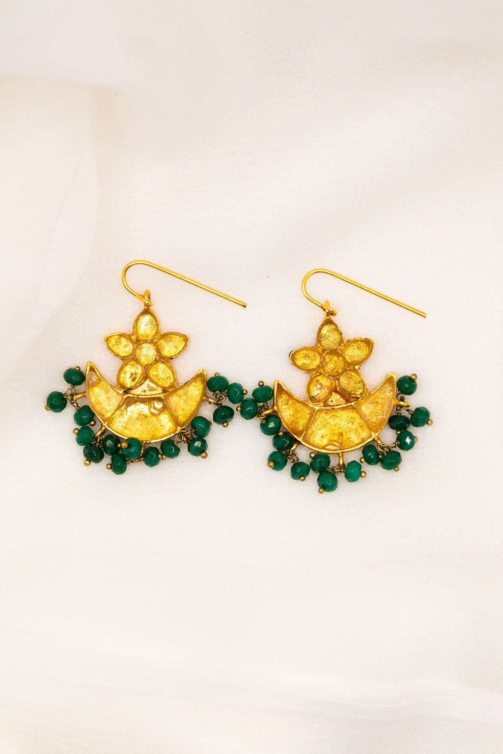 Noor is our traditional chand bali design with a little extra oomph. These crescent danglers are made with 18ct gold plated metal with coloured glass and hanging beads.