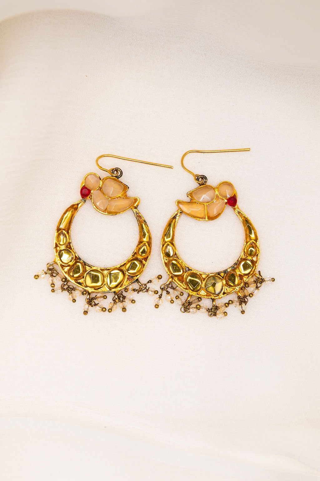Zehra is a traditional chand bali with bird dangler style which is a very popular design. Made with 18ct gold plated metal with coloured glass and beads.